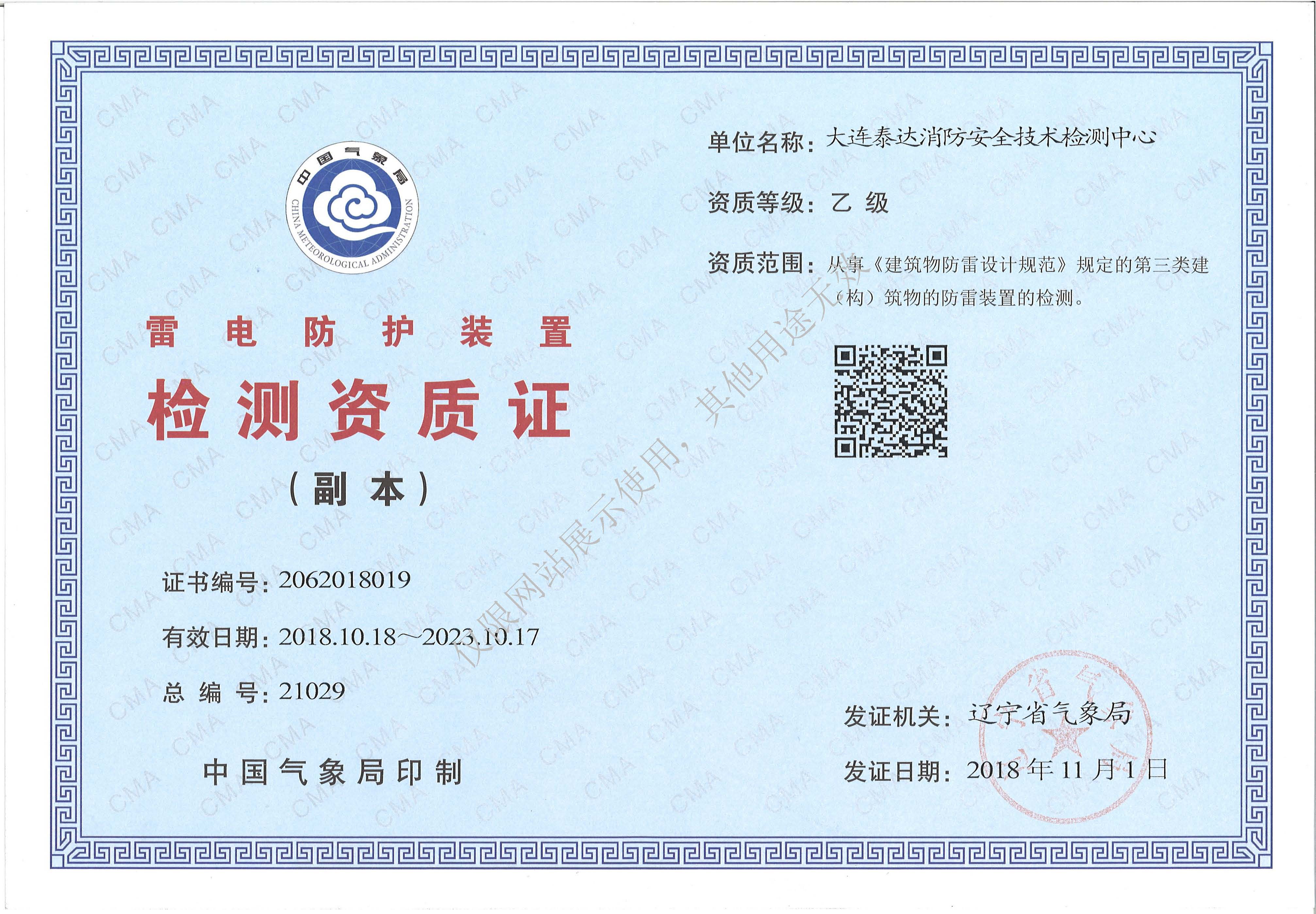· 是經(jīng)“社會(huì)消防技術(shù)服務(wù)信息系統(tǒng)”備案并公示的消防技術(shù)服務(wù)機(jī)構(gòu),已取得中國(guó)氣象局頒發(fā)的雷電防護(hù)裝置檢測(cè)資質(zhì)證書(shū)、遼寧省質(zhì)量技術(shù)監(jiān)督局審核批準(zhǔn)的檢驗(yàn)檢測(cè)機(jī)構(gòu)資質(zhì)認(rèn)定證書(shū)(CMA)及包括消防檢測(cè)、電氣檢測(cè)、雷電防護(hù)裝置檢測(cè)、防火涂層厚度檢測(cè)等在內(nèi)的200余項(xiàng)檢驗(yàn)檢測(cè)能力,取得大連市應(yīng)急管理局頒發(fā)的安全生產(chǎn)標(biāo)準(zhǔn)化證書(shū),獲得質(zhì)量管理體系、環(huán)境管理體系、職業(yè)健康安全管理體系認(rèn)證證書(shū),是經(jīng)備案的高新技術(shù)企業(yè),可獨(dú)立出具具有證明作用的檢測(cè)報(bào)告。